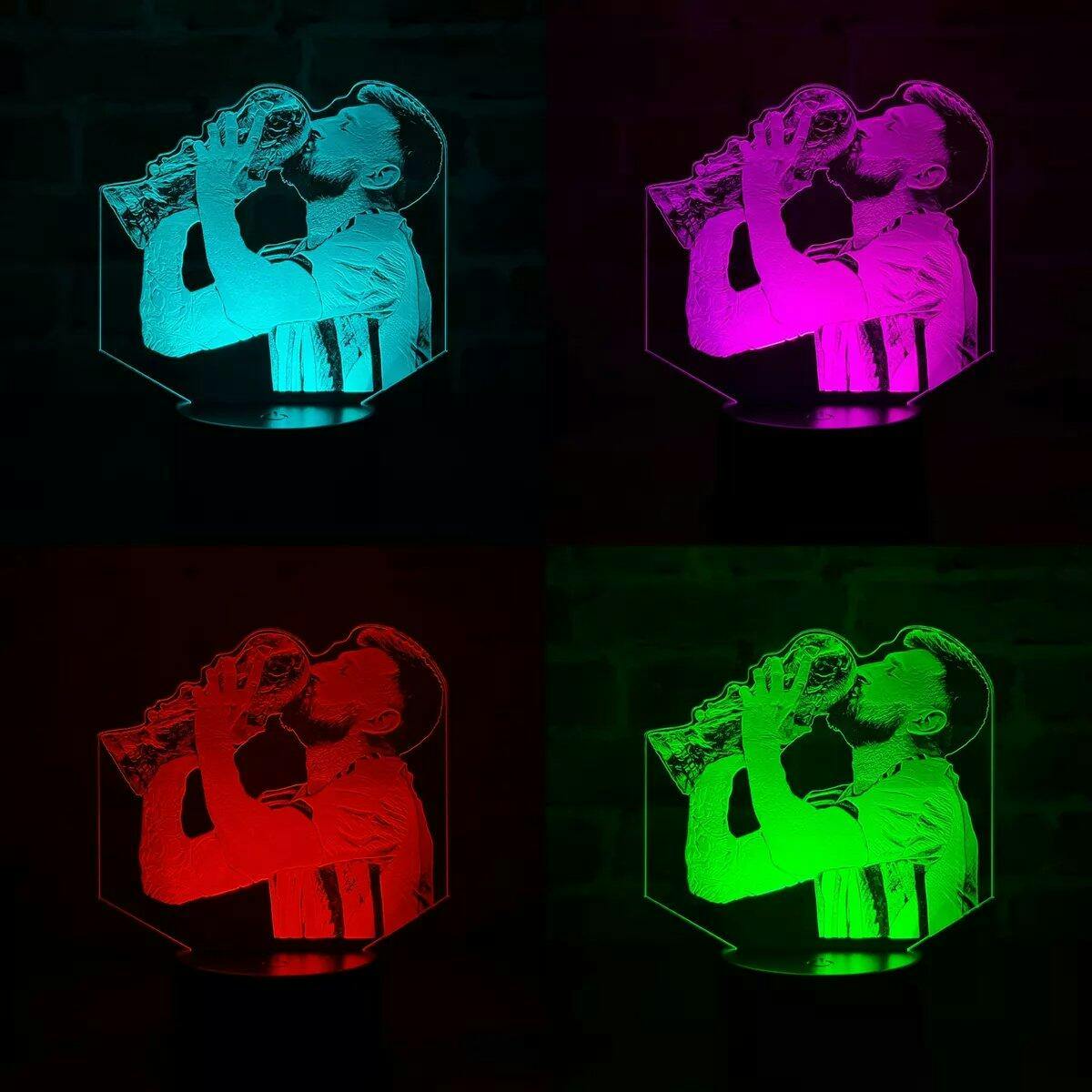 Lámpara led multicolor holográfica, grabada en láser. La lámina de acrílico de 4mm puede retirarse de la base. El encendido y control desde la base es táctil, pero también a control remoto. La alimentación eléctrica es por USB o 3 pilas AA (no incluidas).